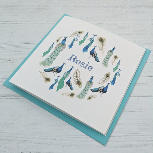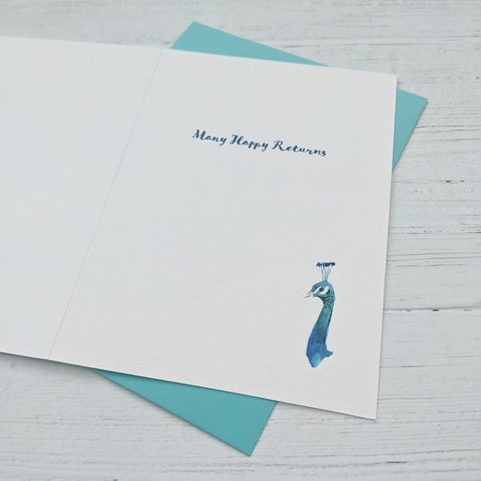 A peacock for a Mrs Peacock, wearing a pair of beautiful flamboyant glasses.
