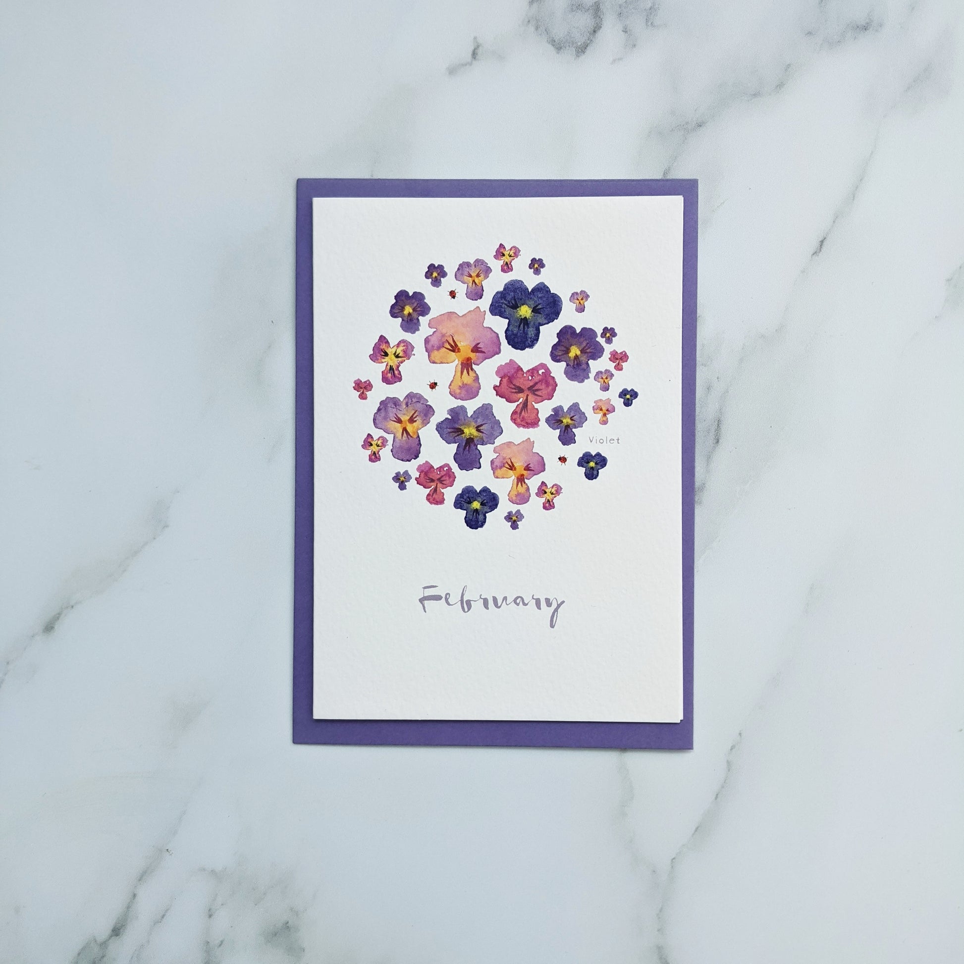 A luxury greetings card, featuring my own watercolour illustrations of purple violets, the birth flower of February.