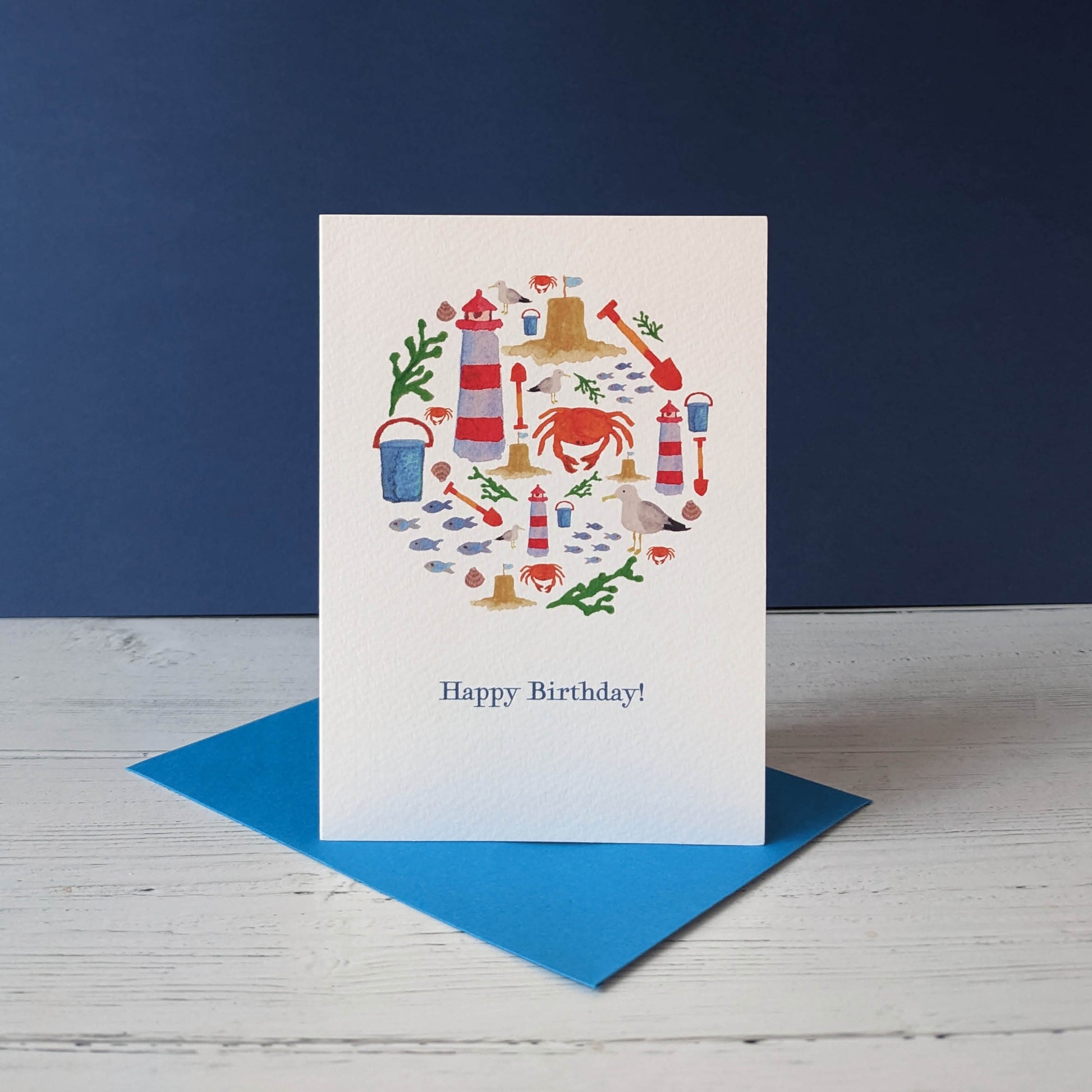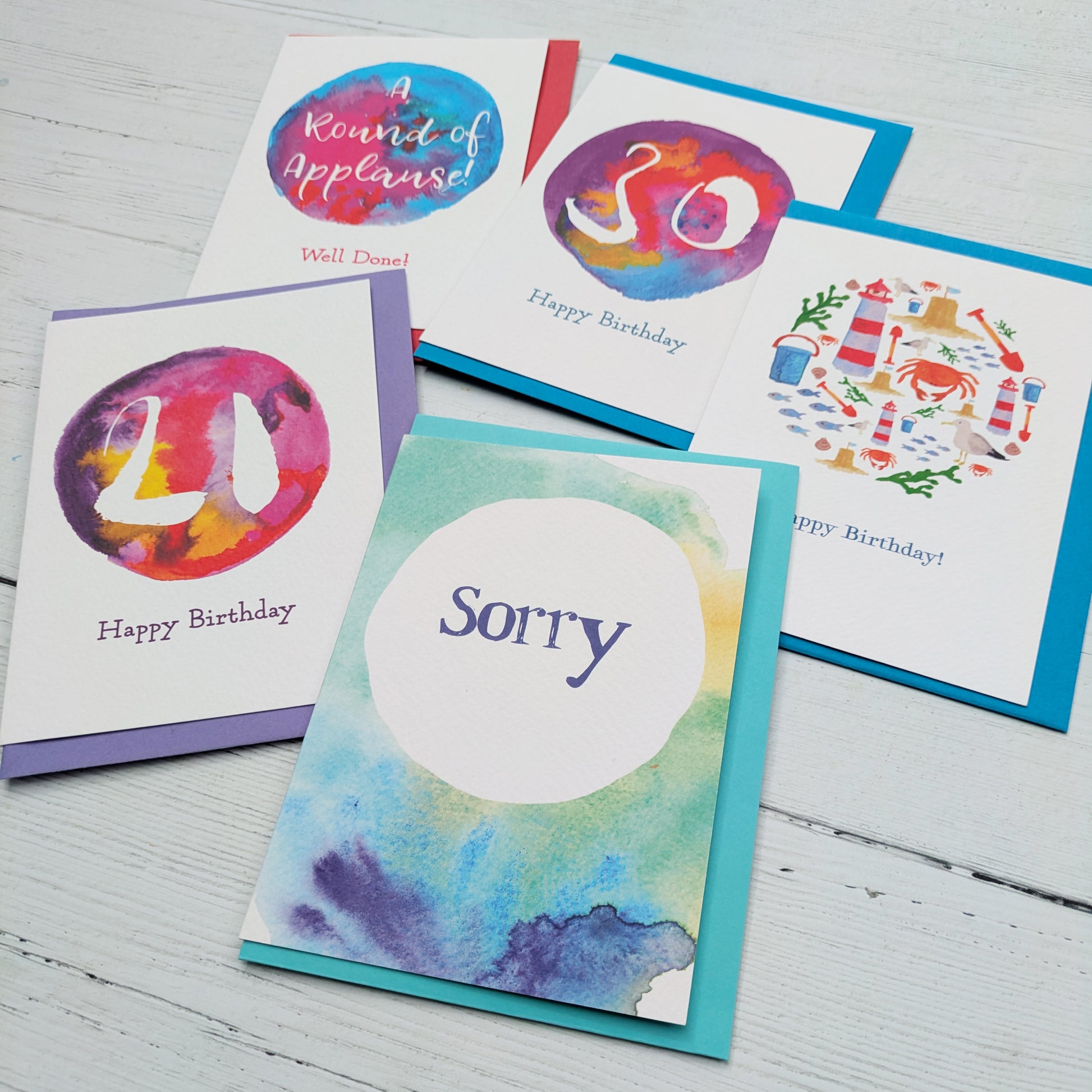 Includes two 'Age' cards, with Many Happy Returns inside, a 'Coastal' birthday card, a 'Sorry' card and a 'Round of Applause' card.